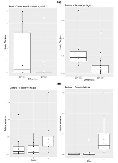 (A). Patients with GEP-NECs have significantly enriched bacteria and fungi (Enterobacter hormaechei, Bacteroides fragilis, and Trichosporon asahii) compared with patients who have GEP-NETs (p = 0.048, 0.0022, and 0.034 respectively). (B). Higher grade (G3) GEP-NETs were associated with significantly higher Bacteroides fragilis (p = 0.022) and Eggerthella lenta (p = 0.00018) species compared to lower grade GEP-NETs (G1/2).
