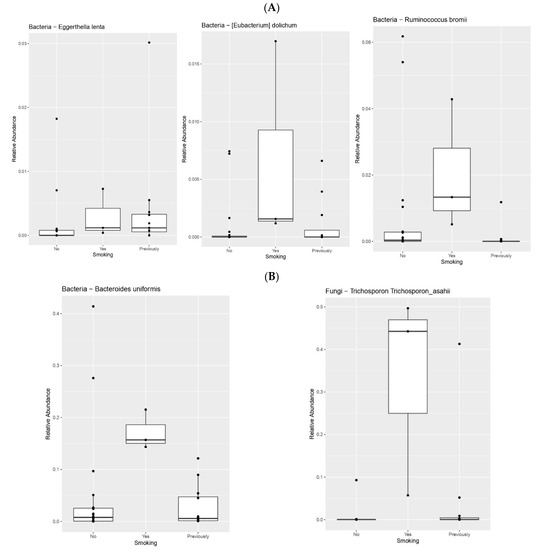 (A) Smokers had significantly more anaerobic, Gram-positive species (Eggerthella lenta, Eubacterium dolichum, and Ruminococcus bromii) (p = 0.03, 0.046, and 0.01, respectively) compared to non-smokers. (B) Smokers had significantly more anaerobic Gram-negative bacteria (Bacteroides uniformis) (p = 0.04), and certain fungi (Trichosporon asahii) (p = 0.005) compared to non-smokers.