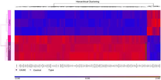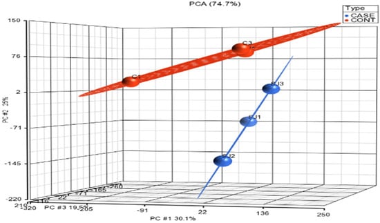 Microarray data were initially visualized using a principal components analysis scatter (PCA) plot (Figure 1). The data from the control group (n = 3) are shown in red, whereas those in the treated group (n = 3) are indicated in blue. Each ball represents gene expression data generated from a sample that was applied on a gene chip. The results of PCA of transcriptomic data as per their overall expression pattern showed that the samples from the same type of treatment cluster together. From the plot, sample outliers were not detected both in the control and in treated group. The control group is also distinguishably separated from those of the treated samples.
