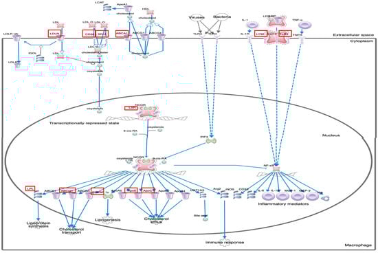 The LXR/RXR activation pathway in macrophage was generated using Ingenuity Target Explorer (QIAGEN, Inc., https://targetexplorer.ingenuity.com/ (accessed on 12 July 2021)). Network interaction between the 15 most differently expressed genes in (LXR/RXR) activation pathway was evaluated using GeneMANIA web tool (https://genemania.org/ (accessed on 16 July 2021)).