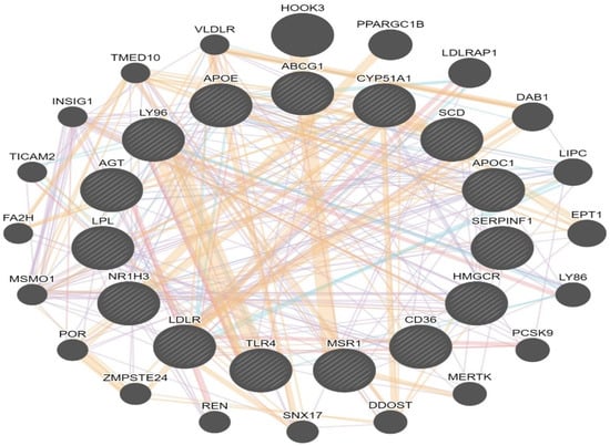 Network of differently expressed genes in the (LXR/RXR) activation pathway. Genes with ratio: 0.615, z-score: 2.8 and −log (p-value): 11.3 (ABCG1, AGT, APOC1, APOE, CD36, CYP51A1, HMGCR, LDLR, LPL, LY96, MSR1, NR1H3, SCD, SERPINF1, TLR4), showing 20 related genes and 301 total links. ABCG1: ATP binding cassette subfamily G member 1, CYP51A1: cytochrome P450 family 51 subfamily A member 1, SCD: stearoyl-CoA desaturase, APOC1: apolipoprotein C1, SERPINF1: serpin family F member, HMGCR: 3-hydroxy-3-methylglutaryl-CoA reductase, CD36: CD36 molecule, MSR1: macrophage scavenger receptor 1, TLR4: toll like receptor 4, LDLR: low density lipoprotein receptor, NR1H3: nuclear receptor subfamily 1 group H member 3, LPL: lipoprotein lipase, AGT angiotensinogen, LY96 lymphocyte antigen 96, APOE apolipoprotein E, HOOK3: hook microtubule-tethering protein 3, PPARGC1B: PPARG coactivator 1 beta, LDLRAP1: low density lipoprotein receptor adaptor protein 1, DAB1: DAB1, reelin adaptor protein, LIPC: lipase C, hepatic type, EPT1: ethanolaminephosphotransferase 1, LY86: lymphocyte antigen 86, PCSK9: proprotein convertase subtilisin/kexin type 9, MERTK: MER proto-oncogene, tyrosine kinase, DDOST: dolichyl-diphosphooligosaccharide--protein glycosyltransferase noncatalytic subunit, SNX17: sorting nexin 17, REN renin, ZMPSTE24: zinc metallopeptidase STE24, POR: cytochrome p450 oxidoreductase, MSMO1: methylsterol monooxygenase 1, FA2H: fatty acid 2-hydroxylase, TICAM2: toll like receptor adaptor molecule 2, INSIG1: insulin induced gene 1, TMED10: transmembrane p24 trafficking protein 10, VLDLR: very low density lipoprotein receptor. Genes uses for research are indicated with stripes. Line color indicates the nature of the identified interaction: purple lines: co-expression; orange line: predicted; cyan: pathway; pink: physical interactions; and blue: co-localization.