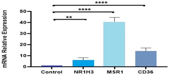 Validation of the microarray data using quantitative real-time PCR. The bar chart shows the gene expression patterns (presented as fold change) of selected significantly up-regulated genes NR1H3 (LXR), MSR1 (SR-A), and CD36 calculated using quantitative real-time PCR. All PCR data were normalized to the intensity of GAPDH as a housekeeping gene. Data represented as mean + SEM following three independent experiments. Statistical analysis was performed using a one-way ANOVA with a Sidak’s test analysis where **: p < 0.01, ****: p < 0.0001.