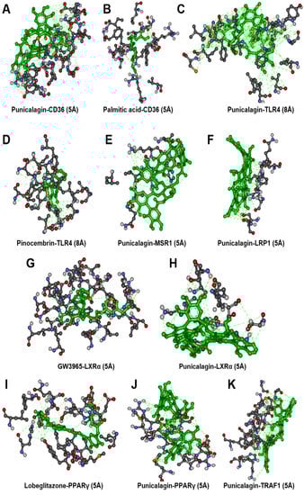 Molecular docking analysis of punicalagin. Molecular docking analysis of punicalagin and respective ligands (represented in green) to CD36 (A,B), TLR4 (C,D), MSR1 (E), LRP1 (F), NR1H3 (G,H), PPARγ (I,J), and TRAF1 (K).