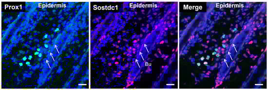 Lymphatic vessels express Sostdc1. Immunofluorescent staining of 10-µm frozen sections of back skin (anagen phase, postnatal day 8) for Prox1 (lymphatic-specific transcription factor, green) and Sostdc1 (red). Nuclear staining with Hoechst 33342 (blue). White arrows indicate the bulge area (Bu). Scale bars: 20 μm.