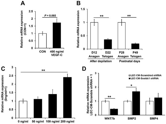 VEGF-C, a lymphangiogenic growth factor, is the major driver of lymphangiogenesis via VEGFR-3 [11,12], and our previous findings indicate that LVs promote HF growth in transgenic mice with increased levels of VEGF-C [15]. It is of interest that incubation of LECs with 400 ng/mL of VEGF-C for 24 h resulted in increased Sostdc1 mRNA expression (Figure 3A). Next, we investigated whether the expression levels of Sostdc1 might undergo cyclic changes during the hair cycle. Importantly, during depilation-induced hair regeneration, the mRNA expression levels of Sostdc1 in the back skin of female C57BL/6J mice were significantly increased during the anagen phase (at day 12 after depilation), as compared with the telogen phase (at day 22 after depilation) (Figure 3B). Similarly, during the postnatal hair cycle, Sostdc1 mRNA expression levels were significantly higher during the anagen phase (P28) than during the telogen phase (P49) (Figure 3B). In the next step, DPCs were treated with 50, 100 or 200 ng/mL recombinant Sostdc1 protein for 72 h. Wnt signaling is required for the development of the HFs, and Lef-1 is a downstream target of Wnt signaling [3,27]. After treatment with 200 ng/mL of Sostdc1, Lef-1 expression was markedly enhanced in DPCs (Figure 3C). These results reveal that Sostdc1, a BMP antagonist, was secreted by LECs and activates DPCs, indicating LVs may stimulate HF growth through Sostdc1 secretion. To further investigate the effects of LEC-secreted Sostdc1 on DPCs, we performed a knockdown of Sostdc1. LECs were infected with adenoviral Sostdc1 shRNA or scrambled shRNA as a control. After 24 h, the growth medium was replaced with EBM containing 2% FBS. Conditioned media of Sostdc1 shRNA treated LECs (LEC-CM-Sostdc1 shRNA) or scrambled shRNA treated LECs (LEC-CM-scrambled shRNA) were collected after 24 h and centrifuged. DPCs were incubated with 50% LEC-CM-Sostdc1 shRNA or LEC-CM-scrambled shRNA for 48 h. Incubation of DPCs with LEC-CM-Sostdc1 shRNA markedly decreased the mRNA expression levels of WNT7b, a stimulatory factor of hair growth [3,28], and increased BMP2 expression, as compared to DPCs incubated with LEC-CM-scrambled shRNA (Figure 3D). No major changes were found regarding the expression of BMP4 mRNA (Figure 3D). Together, these results indicate that lymphatic endothelium might contribute to DPC activation via secretion of Sostdc1. Further studies would be of interest to investigate the distinct biological role of LEC-derived Sostdc1 in hair cycling using lymphatic-specific Sostdc1 knockout mice.