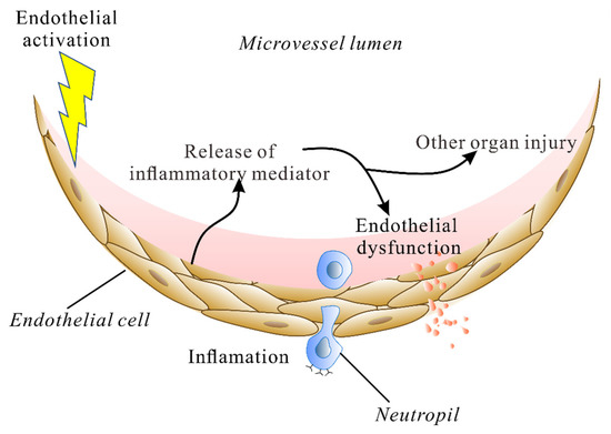 The endothelium is both a sensor of stimulation and a mediator of organ injury in ALI. The endothelium can sense intravascular stimulation and the activation of endothelium results in an increased activation of pro-inflammation transcriptions and release of inflammatory mediators, which leads to dysfunction of endothelium and other organ injury.