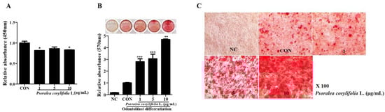 The degree of odontogenic differentiation was measured by ARS staining, and the intensity of staining was quantified using 10% CPC solution (Figure 1B). Figure 1C shows the optical microscopy images at 100× magnification. Thereby, we hypothesized that, during odontoblast differentiation of hDPSCs, P. corylifolia extracts upregulate odontogenic differentiation.