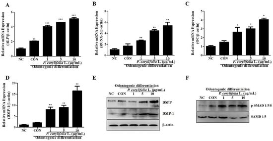 Real-time PCR and western blot analysis during odontogenic differentiation in hDPSCs. (A–D) Odontogenic differentiation marker gene (APL, RUNX-2, OC, and DMP-1) expression in hDPSCs treated with 1, 5 and 10 μg/mL of P. corylifolia extracts. (E) Western blot analysis for the expression of odontogenic differentiation protein markers DMP-1 and DSPP expression. (F) Western blot analysis to determine the effect of P. corylifolia extracts on SMAD 1/5/8 phosphorylation. All data are presented as the mean ± SEM (n = 3). * p < 0.05, ** p < 0.02, *** p < 0.01. SEM, standard error of mean; NC, negative control; CON, positive control; hDPSCs, human dental pulp stem cells; PCR, polymerase chain reaction.