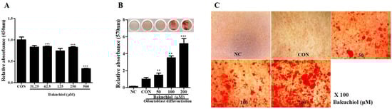 To evaluate the effects of bakuchiol, concentrations of 50, 100 and 200 µM were used for CCK-8 assay and odontogenic differentiation. The cell viability decreased by only 10%, except at 500 μM. The ratio was less than 20% at 250 μM. Since we wanted to choose no cell-toxicity bakuchiol concentrations, this experiment used bakuchiol concentrations of 50, 100 and 200 μM, which were reasonable. The hDPSCs were treated for 10 days with bakuchiol to induce odontogenic differentiation, and the differentiation ability was determined by ARS staining. The degree of differentiation quantified using a 10% CPC solution of each concentration is shown in a micrograph (Figure 3A–C). The results indicated that bakuchiol is a mono compound form P. corylifolia that can induce odontogenic differentiation.