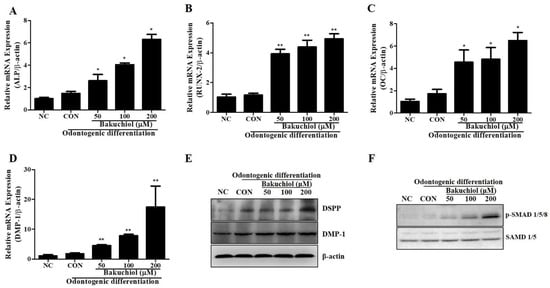 The expression of differentiation markers was observed after treatment with bakuchiol during odontogenic differentiation induction. Compared to that in the control groups, the expression of ALP, RUNX-2, OC, and DMP-1 and levels of the differentiation marker proteins DMP-1 and DSPP increased in the bakuchiol-treated groups (Figure 4).