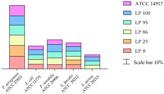 The numerical data of the antimicrobial activity, estimated as clear zone of inhibition ZOI (mm), exhibited by LABs against various indicator bacteria are presented in Table S2 (Supplementary Material). In Figure 1, the results are shown as inhibition rate (%). More specifically, no antimicrobial activity was observed when MRS pH 3.8 was used, while the six tested L. plantarum strains presented different inhibitory activities against the five indicator bacteria. The cell free supernatant (CFS) of all six L. plantarum strains inhibited the development of P. aeruginosa and E. faecalis. With the exception of LP 25, the other LAB strains were effective against E. coli and P. mirabilis. The L. plantarum LP 86, LP 95, LP 100 and ATCC 14917 strains were effective in counteracting the growth of S. aureus. The highest antagonistic activity of the tested L. plantarum strains was against P. aeruginosa with a ZOI between 18 (LP 100) and 24 mm (LP 8).