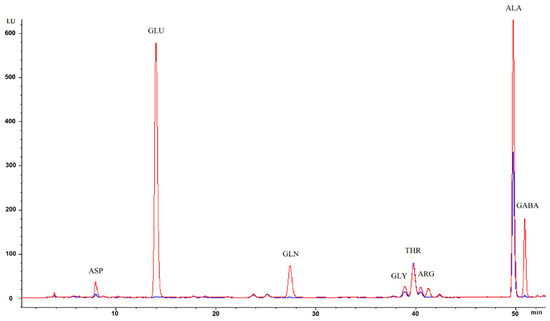 For the GABA production assay, the L. plantarum strains were grown at 37 °C in LFM medium, whose composition is reported in Table S1 (Supplementary Material). The broth cultures (10 mL; 106 CFU/mL) were centrifugated to obtain the cell pellet (CPLFM). The CPLFM were washed twice in sterile saline solution (NaCl 0.9%, w/v), resuspended in 600 μL of ethanol/water (40/60, v/v), and then subjected to three cycles of sonication (Labsonic M; Sartorius Lab Instruments GmbH & Co. KG, Goettingen, GE Sartorius Lab Instruments GmbH & Co. KG, Goettingen, GE) at 12 W for 30 s, with 60 s of pause between the cycles to improve cellular lysis. Subsequently, the samples were centrifugated at 13,000 rpm for 5 min at 4 °C and cell extract supernatants (CESLFM) were used for GABA quantification via High Performance Liquid Chromatography (HPLC) using a Hewlett Packard 1100 (Agilent, Santa Clara, CA, USA) equipped with Degasser G1322A, Binary Pump G1312A, Autosampler ALS G1313A, Thermostatted Column Compartment G1316A, DAD Detector G1315B and Fluorescence Detector G1321A.