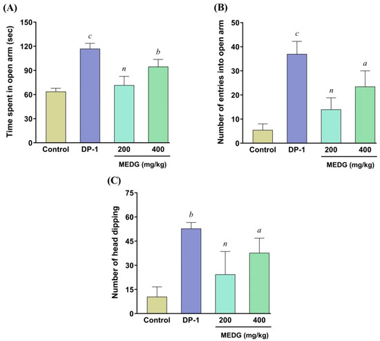 Effect of oral administration of MEDG on elevated plus maze test, time spent in open arm (A), the number of entries into open arm (B), and hole board test (C) in mice. The results were expressed as mean ± SEM, (n = 6), and a p < 0.05, b p < 0.01, and c p < 0.001 were statistically significant and (n) = non-significant compared with the control group followed by Dunnett’s test (one-way ANOVA). DP = diazepam; MEDG = methanol extract of D. grandiflora stem barks.