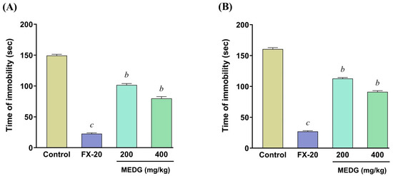 Effect of oral administration of the MEDG on the immobility time of forced swimming test (A) and tail suspension test (B) in mice. The results were expressed as mean ± SEM (n = 6), and b p < 0.01, and c p < 0.001 were statistically significant compared with the control group followed by Dunnett’s test (one-way ANOVA). FX-20 = fluoxetine HCl 20; MEDG = methanol extract of D. grandiflora stem barks.