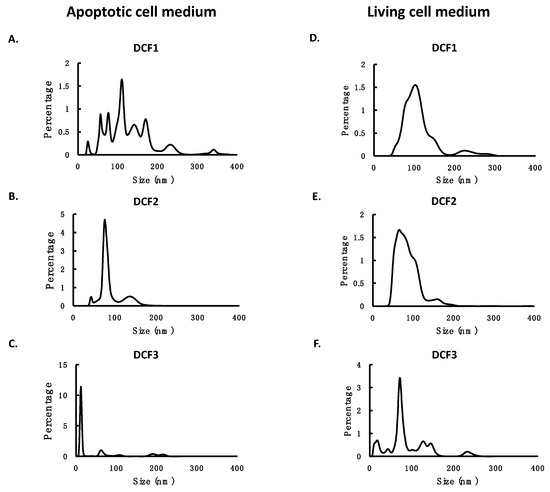 The particle size profiles of different differential centrifugation fractions of EVs from the medium with apoptotic cells (A–C) and that with living cells (D–F). DCF1, DCF2, and DCF3 were three fractions of the media derived from two-step centrifugation, as described in Materials and Methods.