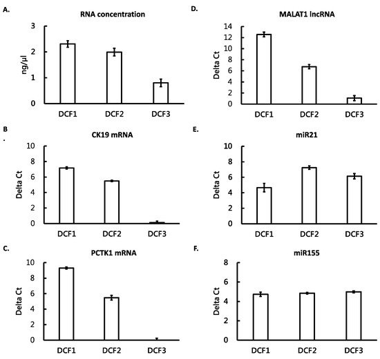 RNA contents in different DC fractions of EVs from medium with living cells. DCF1, DCF2, and DCF3 were three fractions of the media derived from two-step centrifugation, as described in Materials and Methods. RNA was purified from the fractions and its concentration was determined by a Qubit fluorometer (A). The levels of different RNA species were measured by RT-qPCR. These RNA species included mRNAs of CK19 and PCTK1 (B,C, respectively), lncRNA of MALAT1 (D), and miRNAs of miR21 and miR155 (E,F, respectively). All the measurements were performed in triplicate and the bars are shown as mean ± standard error.