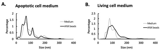 We have previously shown that ANX beads could capture EVs from conditioned medium and human plasma [31]. In the present study, we further characterized the captured EVs from media with living cells and media with apoptotic cells. The media were first mixed with ANX beads to let EVs be captured, and then the captured EVs were eluted and analyzed by NTA. The results showed that the ANX beads could capture large (>100 nm) and small (<100 nm) particles (Table 1). From either the medium with apoptotic cells or that with living cells, the size profile of the captured EVs were similar to that in the media (Figure 3). The NTA data showed that the size of ANX bead-captured EVs ranged from 19.5 to 571.5 nm in apoptotic cell medium and from 45.5 to 653.5 nm in living cell medium. This fact suggested that these different sized EVs can associate with the ANX beads.