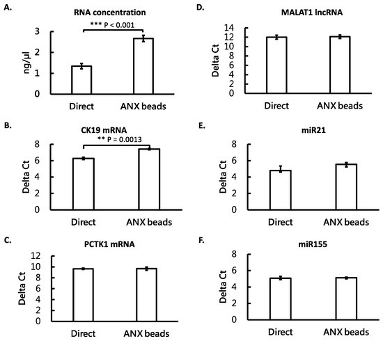 ANX beads could recover RNA from cultured medium. The media with living cells were either subjected to RNA extraction directly or first mixed with ANX beads to capture EVs and then subjected to RNA extraction. Total RNA concentration was determined by a fluorometer (A). The levels of different RNA species were measured by RT-qPCR. These RNA species included mRNAs-CK19 and PCTK1 (B,C, respectively), lncRNA-MALAT1 (D), and miRNAs-miR21 and miR155 (E,F, respectively). All the measurements were performed in triplicate and the bars are shown as mean ± standard error. Student’s t test was used to compare the groups. ** p < 0.01; *** p < 0.001.