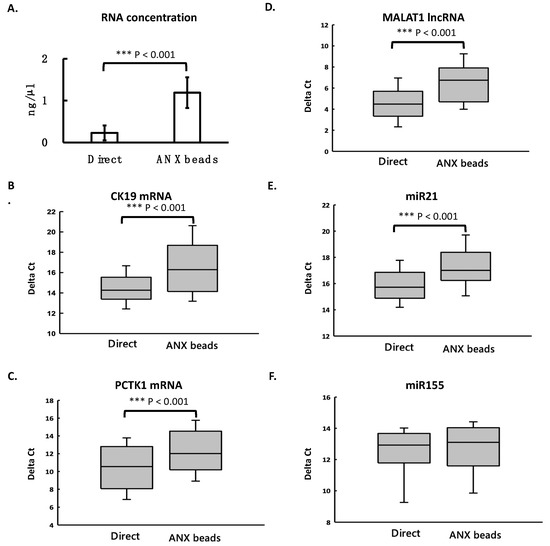 ANX beads increased exRNA recovery from plasma samples. The plasma samples (n = 50) were either subjected to RNA extraction directly or first mixed with ANX beads to capture EVs and then subjected to RNA extraction. Total RNA concentration was determined by a fluorometer (A). The levels of different RNA species were measured by RT-qPCR. These RNA species included mRNAs-CK19 and PCTK1 (B,C, respectively), lncRNA-MALAT1 (D), and miRNAs-miR21 and miR155 (E,F, respectively). Student’s t-test was used for statistical analysis. Results were considered significant at p < 0.05. *** p < 0.001.