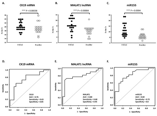 The diagnostic performance of circulating CK19 (A,D), MALAT1 (B,E) and miR155 (C,F) RNA for NSCLC using ANX beads. Plasma samples from NSCLC patients (n = 22) and healthy controls (n = 20) were subjected to RNA purification with ANX beads and RNA quantification with RT-qPCR. The diagram shows the distribution of the RNA levels of different groups (A–C) and their receiver operating characteristic curves (D–F). *** p < 0.001.