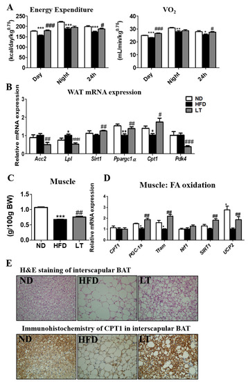 3.2. LT Supplementation Increased EE and Regulated mRNA Expression of WAT and Muscle