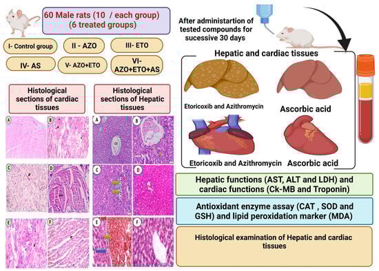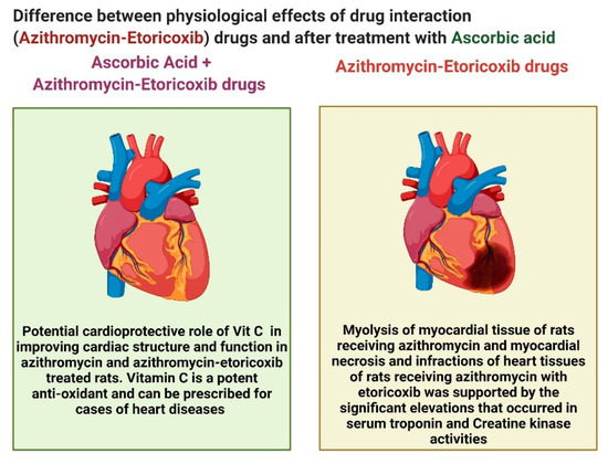 Previous studies from Qinna et al. [35] confirmed that ascorbic acid can enhance the restoration of normal hepatic functions. This significantly confirms the current findings as we proved both the hepatoprotective and cardioprotective effects of ascorbic acid after azithromycin and etoricoxib-treatment, compared to treatment with azithromycin and etoricoxib alone.