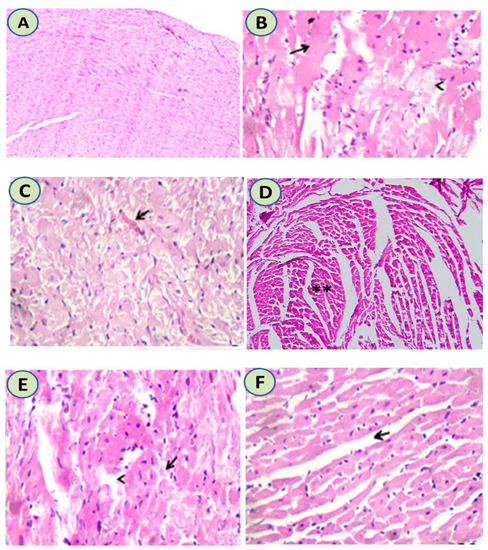 (A) The heart tissue of the control group was normal in structure (H&EX200). (B) Azithromycin-treated group showed hyaline degeneration associated with pyknotic nuclei and myolysis (H&EX400). (C) Etoricoxib-treated group showed intramuscular edema and congested capillaries, and partial necrotic changes were evident in the myocardium. (H&EX400) (D) Ascorbic acid-treated group showed normal cardiac tissues with normal intramuscular muscles (**) with normal sized nuclei (H&EX200). (E) Etoricoxib-azithromycin treated group showed hyalinized or necrotic myocardial muscle fibers alongside a few scattered lymphocytes among necrotic muscle fiber (H&EX400). (F) Upon administration of ascorbic acid with azithromycin and etoricoxib, it was shown that the majority of muscle fibers nearly returned to their normal state with mild edema and few scattered lymphocytes (H&EX400).