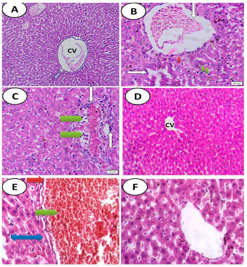 (A) Cross section of hepatic tissues of control group showing normal hepatic structure with normal hepatocytes (H&EX100). (B) Photomicrograph of cross section of experimental rat liver after administration of azithromycin, showing marked toxicity in the form of hypertrophy of hepatocytes with appearance of binucleated hepatocytes (green arrow), increased eosinophilia, granular cytoplasm and vesicular nuclei (red arrow), with damage of the normal architecture of the liver, the portal vein dilated and congested (white arrow), dilatation of some blood sinusoids, infiltration by inflammatory cells, and appearance of apoptotic bodies (H&EX400). (C) Photomicrograph of cross section of experimental rat liver after administration of etoricoxib drug showing marked toxicity in the form of hypertrophy of hepatocytes with appearance of binucleated hepatocytes and increased eosinophilia, granular cytoplasm and vesicular nuclei (green arrow), with damage of the normal architecture of the liver, the portal vein dilated and congested (white arrow), new bile duct formation, ductular reaction at the periphery of the portal tract, and infiltration of the portal tract by mononuclear inflammatory cells. (D) Cross section of experimental rat liver after administration of ascorbic acid showing normal hepatic structure with normal central vein (CV) and normal hepatocytes (H&EX200). (E) Photomicrograph of cross section of experimental rat liver after administration of combination of azithromycin and etoricoxib drugs showing severe toxicity in the form of hypertrophy of hepatocytes with granular eosinophilic cytoplasm and vesicular nuclei and appearance of some binucleated cells, marked dilatation of the central vein and severe hemorrhage (green arrow), perivenular fibrosis (blue two-headed arrow), focal areas of necrosis, and ballooning degeneration in some hepatocytes (red arrow) (H&EX400). (F) Photomicrograph of cross section of experimental rat liver after administration of combination of azithromycin and etoricoxib drugs combined with ascorbic acid showing high alleviation of drug toxicity with mild toxicity in the form of hypertrophy of hepatocytes with granular eosinophilic cytoplasm and vesicular nuclei and appearance of some binucleated cells with slightly dilated central vein lined by endothelial cells (H&EX400).