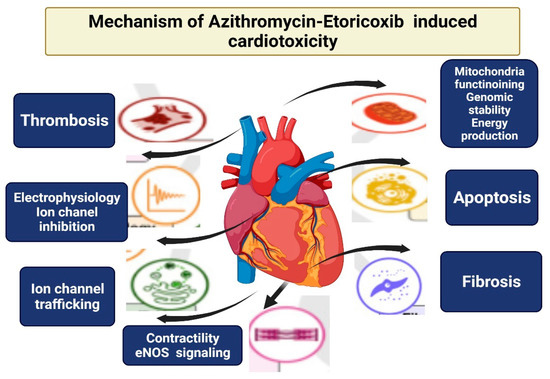 The general results from the simultaneous interruption of myocardial functions and viabilities could confirm the cardiotoxicity induced by both azithromycin and etoricoxib. The adverse drug effects were the disruption of electrophysiology, contractility, mitochondrial toxicity, growth factor, and cytokine regulation. These mechanisms of drug cardiotoxicity are shown in Figure 5. The mechanism underlying adverse cardiac series often exert their action through complex cellular signaling pathways. The main signaling pathways underlie the drug interactions’ cardiotoxicity.
