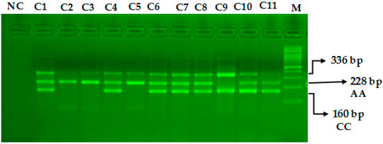 The miR-423-rs6505162 C>A PCR products were resolved through 2% agarose gel electrophoresis stained with Sybre safe dye. The gel image was visualized by gel documentation system from Bio-Rad. Outer primers FO and RO amplify the interested region of the miR-423-rs6505162 C>A genotyping gene site and generating a band of 336 bp and that serve as a control for DNA purity. Primers FI and RO amplify a C genotype generating a band of 160 bp, and primers FO and RI generate a band of 228 bp from the T genotype as shown in Figure 1 and Figure 2.