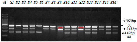 The ARMS PCR is a powerful technique for detecting any mutation involving a single-base change. However, the optimization step required hard work and is time-consuming. For optimization of miR-423-rs6505162 C>T and VEGF-2578 C>A genotyping a gradient PCR was performed using different annealing temperatures and a lesser number of cycles were used (25 to 30 cycles). We made some small changes in the reagent concentrations, which significantly affected the PCR—especially MgCl2. Balancing the inner primers band was a key step. In order to balance the inner primers band, it was important to observe the band intensity and which band was the weakest in order to promote this band by increasing its concentration. This optimization for miR-423-rs6505162 C>T and VEGF-2578 C>A genotyping was achieved in a series of optimization experiments in a single run by the gradient PCR machine following some previous reported studies [21,22,23,24]. The annealing temperature via gradient PCR was optimized from 58 °C to 62 °C, but the best results were obtained at a temperature 62 °C for miR-423-rs6505162 C>T as depicted in Figure 1 and Figure 2. Similarly, the best results were obtained for VEGF-2578 C>A genotyping at a temperature 58 °C as depicted Figure 3. The use of our ARMS-PCR for of miR-423-rs6505162 C>T and VEGF-2578 C>A genotyping fulfils our goal. ARMS-PCR proved to be rapid, accurate, inexpensive and highly applicable.