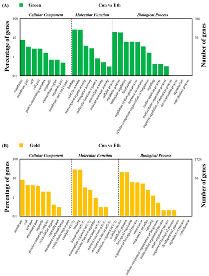 GO classification of the DEGs of control vs. ethylene in (A) green ‘Hayward’ and (B) gold ‘Haegeum’ kiwifruit.