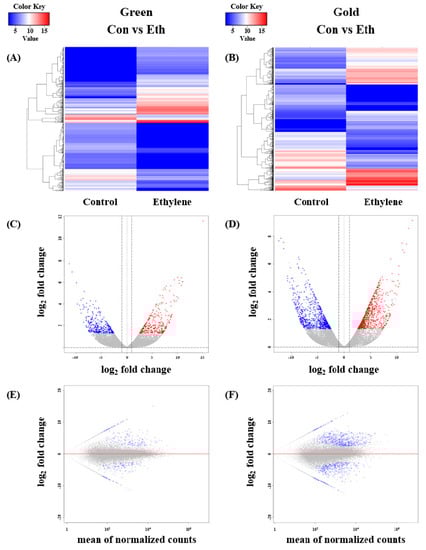 The transcriptional profiles of control vs. ethylene in green ‘Hayward’ and gold ‘Haegeum’ kiwifruit. (A,B) Heat map visualization. Each gene is represented by a single row. Red indicates relatively high levels, genes with relatively low levels are shown in blue. (C,D) Volcano plot of the identified genes. The DEGs are shown in red and blue, black indicates genes that were not differentially expressed. (E,F) MA plot of the identified genes. The DEGs are shown in gray (p > 0.05) and blue (p < 0.05).