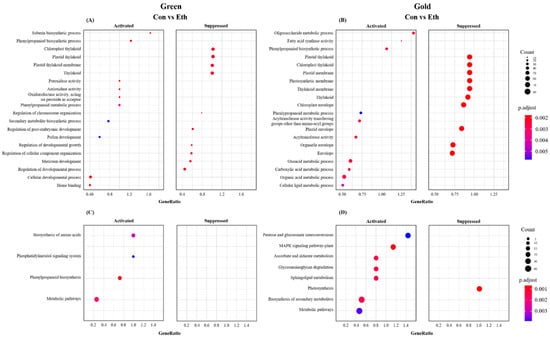 Go enrichment analysis was applied to investigate the major biological processes affected by ethylene treatment (Figure 3A,B). We identified 20 Go terms that were represented (p-adj < 0.01) in response to ethylene treatment. The lowest p values for activated biological processes were for “organic acid metabolic process”, “carboxylic acid metabolic process”, “carboxylic acid metabolic process”, “acyltransferase activity”, “acyltransferase activity transferring groups other than amino-acyl groups”, “phenylpropaniod biosynthetic process”, “fatty acid synthase activity”, and “oligosaccharide metabolic process” in green ‘Hayward’ kiwifruit; and “heme binding”, “cellular developmental process”, “oxidoreductase activity, acting on peroxide as acceptor”, “antioxidant activity”, and “peroxidase activity” in gold ‘Haegeum’ kiwifruit. On the other hand, “envelope”, “organelle envelope”, “plastid envelope”, “chloroplast envelope”, “thylakoid”, “thylakoid membrane”, “photosynthetic membrane”, “plastid membrane”, “chloroplast thylakoid”, and “plastid thylakoid” were suppressed in green ‘Hayward’ kiwifruit; “regulation of developmental process”, “meristem development”, “regulation of cellular component organization”, “regulation of developmental growth”, “regulation of post-embryonic development”, “regulation of chromosome organization”, “thylakoid”, “plastid thylakoid”, and “chloroplast thylakoid” were suppressed in gold ‘Haegeum’ kiwifruit. KEGG pathway enrichment analysis of DEGs identified significantly enriched “metabolic pathways” and “biosynthesis of secondary metabolites” in green ‘Hayward’, and it identified “metabolic pathways” and “biosynthesis of amino acids” in gold ‘Haegeum’ kiwifruit (Figure 3C,D).