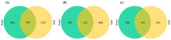 Venn diagram showing the number of differentially expressed genes (log2 fold change equal or greater than 1 and p < 0.05) total (A), upregulated (B), and downregulated (C), between green ‘Hayward’ and gold ‘Haegeum’ kiwifruit cultivars after 3 days of ripening with ethylene treatment or without ethylene treatment (control) at 25 °C.