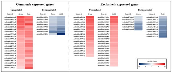 We identified a total of 26,130 and 28,605 transcripts during the comparison of control vs. ethylene-treated green ‘Hayward’ and gold ‘Haegeum’ kiwifruit, respectively (part C in Table 1). Differentially expressed genes (DEGs) were compared based on log2 fold change and p < 0.05 during comparison of control to ethylene. A total of 1287 and 1724 unigenes were differentially expressed during the comparison of control vs. ethylene in green ‘Hayward’ and gold ‘Haegeum’ kiwifruit, respectively.