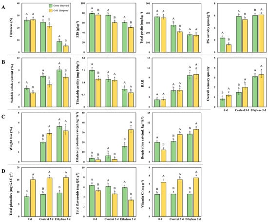 Firmness, EIS, total pectin and PG activity (A); soluble solids content (SSC), titratable acidity (TA), Brix/acid ratio (BAR) and overall sensory quality (B); weight loss, ethylene production and respiration rates (C); total phenolics, total flavonoids and vitamin C (D) of green ‘Hayward’ and gold ‘Haegeum’ kiwifruit on day 0 and third day of ripening at 25 °C with ethylene treatment or without treatment (control). Data are presented as a mean ± standard errors in 10 replicates for firmness, SSC, TA, BAR and overall sensory quality; and in 5 replicates for the other parameters. The bars with different upper-case letters indicate a significant difference (p < 0.05) between cultivars, the bars with different lower-case letters indicate a significant difference (p < 0.05) between treatments.