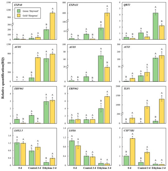 qRT-PCR transcript accumulation of the selected DEGs of green ‘Hayward’ and gold ‘Haegeum’ kiwifruit for the comparison of fruit on day 0 and third day of ripening at 25 °C with ethylene treatment or without treatment (control). Vertical bars represent standard errors of the means (n = 3). The bars with different upper-case letters indicate a significant difference (p < 0.05) between cultivars, whereas the bars with different lower-case letters indicate a significant difference (p < 0.05) between treatments. The names of genes are indicated: EXPA8 (expansin-A8-like), EXPA11 (expansin-A11), QRT1 (pectinesterase QRT1), ACO1 (1-aminocyclopropane-1-carboxylate oxidase 1), ACO3 (1-aminocyclopropane-1-carboxylate oxidase 3), ACS3 (1-aminocyclopropane-1-carboxylate synthase 3), ERF061 (ethylene-responsive transcription factor ERF061), ERF062 (ethylene-responsive transcription factor ERF062), TLP1 (thaumatin-like protein), LOX1.5 (probable linoleate 9S-lipoxygenase 5 isoform X2), LOX6 (lipoxygenase 6, chloroplastic), and CYP75B1 (flavonoid 3’-monooxygenase-like isoform X2).