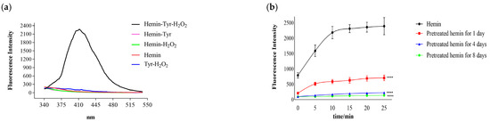 Hemin catalyzes the reaction of tyrosine and hydrogen peroxide to produce dityrosine with fluorescence. (a) The addition of hemin increased the fluorescence intensity of the mixture of tyrosine and hydrogen peroxide. Reaction mixtures were prepared containing 0.7 μM hemin, 0.1 mM Tyr, and 1 mM H2O2. (b) Catalysis of the hemin pretreated with hydrogen peroxide or not: the reaction time was 25 min, the fluorescence intensity was detected every 5 min, the results are expressed as the means ± SDs (n = 8), and the last data points show comparisons with hemin at 25 min; **** p < 0.0001.