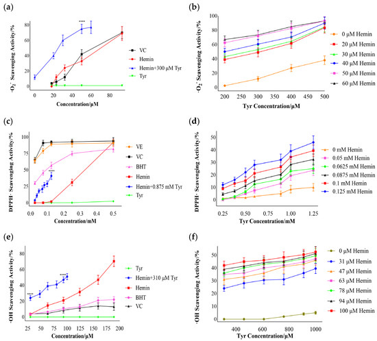 The mixture of hemin and tyrosine exhibited radical-scavenging activities. (a) The superoxide anion-scavenging activity of the mixture (hemin-Tyr) with added tyrosine was 300 µM; the data points show comparisons with 50 μM hemin, **** p < 0.0001. (b) Effects of tyrosine and hemin on superoxide anion-scavenging ability for the mixture (hemin-Tyr). (c) DPPH·-scavenging activity of the mixture (hemin-Tyr) with added tyrosine was 0.875 mM; the data points show comparisons with 0.125 mM hemin, **** p < 0.0001. (d) Effects of tyrosine and hemin on the DPPH·-scavenging ability of the mixture (hemin-Tyr). (e) Hydroxyl free-radical-scavenging activity of the mixture (hemin-Tyr) with added tyrosine was 310 µM; the dots show comparisons with 30 and 90 μM hemin, **** p < 0.0001. (f) Effects of tyrosine and hemin on the hydroxyl free-radical-scavenging ability of the mixture. Results are expressed as means ± SDs (n = 6).