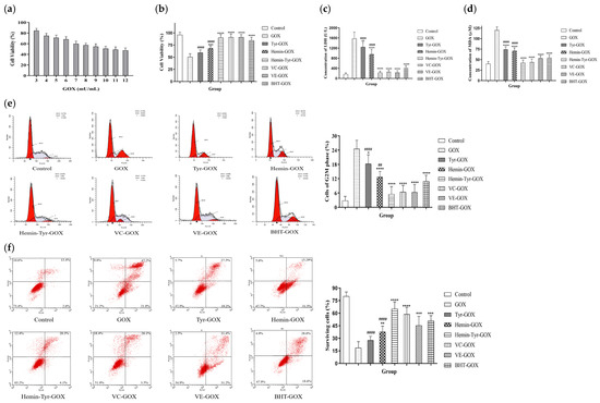 Cells were treated with GOX, Tyr-GOX, Hemin-GOX, Hemin-Tyr-GOX, VC-GOX, VE-GOX, and BHT-GOX and incubated at 37 °C under 5% CO2. For the MTT and LDH assays, the cells (200 μL/hole) were subcultured in 96-well cell culture plates. For measurements of MDA, cell-cycle arrest, and cell apoptosis, the cells (2 mL/hole) were subcultured in a 6-well cell culture plate. Control-group cells were not incubated with GOX but were treated with PBS.