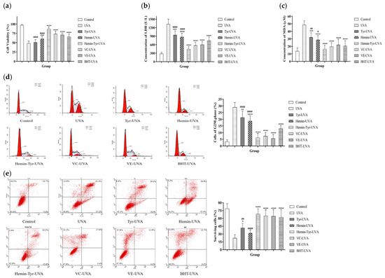 The mixture of hemin and tyrosine protected HaCaT cells from UVA-induced oxidative damage. After UVA irradiation, HaCaTs were incubated with an FBS-free medium and a different medium containing 50 μM hemin, 200 μM tyrosine, 50 μM vitamin C, 50 μM vitamin E, or 50 μM BHT. (a) Then, the cell viability of (b) LDH and (c) MDA was measured by MTT assay. (d) Cell-cycle and (e) apoptosis detected by flow cytometry. Data are shown as the means ± SDs (n = 6), compared with the UVA group; * p < 0.05, ** p < 0.01, *** p < 0.001, and **** p < 0.0001, compared with the hemin-Tyr-UVA group; # p < 0.05, ## p < 0.01, and #### p < 0.0001.