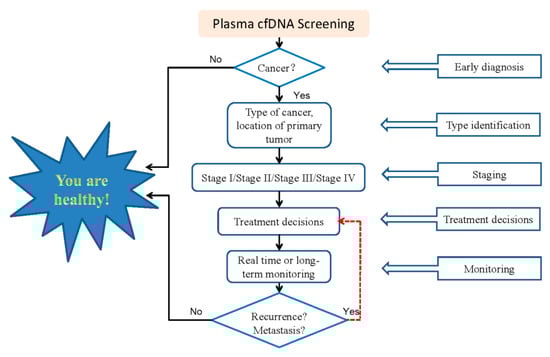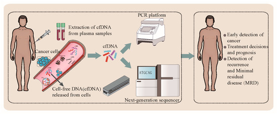 The global liquid biopsy industry is expected to exceed USD 5 billion by 2023 [12]. A liquid biopsy is a minimally invasive or non-invasive method to analyze a range of tumor material in blood or other body fluids, including circulating tumor cells (CTCs), cell-free DNA (cfDNA), messenger RNA (mRNA), microRNA (miRNA), and exosomes, which is a very promising technology [13,14]. Among these cancer biomarkers, plasma cfDNA is the most widely used in clinical practice [15,16,17,18]. CfDNA released from tumors is also called circulating tumor DNA (ctDNA). CfDNA was first reported by Mandel and Metais in 1948 [19]. Leon et al. described cfDNA for the first time in the field of oncology, reporting cfDNA levels higher in cancer patients than in healthy individuals [20]. CfDNA comprises extracellular DNA molecules released into the blood through different mechanisms, including apoptosis, necrosis, senescence and active secretions [21,22]. Compared with tissue biopsy of traditional cancer diagnosis, in assessing tumor heterogeneity, a liquid biopsy is more reliable because all tumor sites release cfDNA into the blood. Therefore, a cfDNA liquid biopsy is less invasive and comprehensive. Moreover, the development of next-generation sequencing (NGS) technology makes cfDNA sequencing more sensitive than a tissue biopsy, with higher clinical applicability and wider application (Table 1). In this publication, we review the latest perspectives of cfDNA liquid biopsy clinical significance and application in cancer diagnosis, treatment, and prognosis. We introduce the sequencing techniques and challenges of cfDNA detection, analysis, and clinical applications, and discuss future research directions (Figure 1).