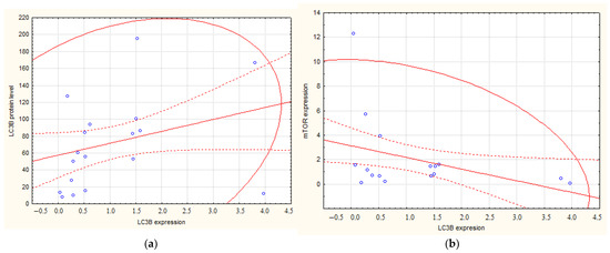 There was a correlation between the level of LC3B mRNA before treatment and the protein content after NACT, as measured by Western blotting analysis (r = 0.43; p = 0.013) (Figure 1a). A negative relationship was also revealed between the studied parameter and mTOR expression (r = − 0.38; p = 0.03) (Figure 1b).