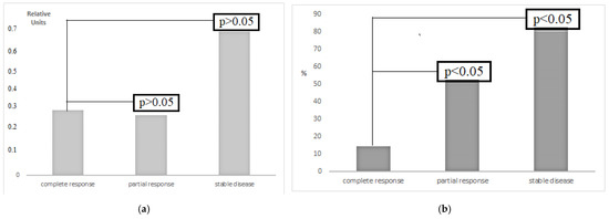 The LC3B mRNA level in GCs before therapy was not associated with the response to treatment. However, a relationship between the LC3B content after NACT and the therapy’s effectiveness in cancers was found. An increase in the protein level by 3.65 and 5.78 times as a consequence was noted in patients with partial response and stabilization, respectively, when compared to patients with complete response (Figure 3). The data obtained indicate the role of autophagy in the GCs resistance to therapy.