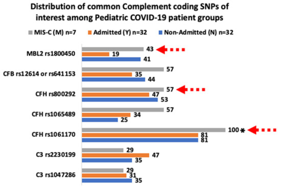 In line with the data on adults, a few studies have also supported the involvement of complement deregulation in severe COVID-19 in pediatric patients, which primarily manifests as SARS-CoV-2 induced Multisystem Inflammatory Syndrome in Children (MIS-C) (CDC, HAN Archive-00432) [36]. Our central aim was to identify complement coding SNPs of interest in patients with COVID-19 induced MIS-C or Kawasaki-like MIS-C pathologies (CDC, HAN Archive-00432) and compare their distributions in pediatric patients with acute COVID-19 that required admission or not.