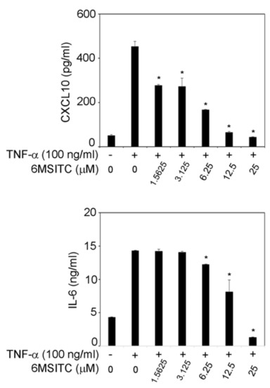 Figure 2 shows that TNF-α (100 ng/mL) increased IL-6 and CXCL10 release in TR146 cells. When 1.5625–25 μM 6-MSITC was added, CXCL10 production in TNF-α-stimulated TR146 cells was significantly inhibited (Figure 2). TNF-α-induced IL-6 production in TR146 cells was decreased by 6.25–25 μM 6-MSITC treatment (Figure 2).