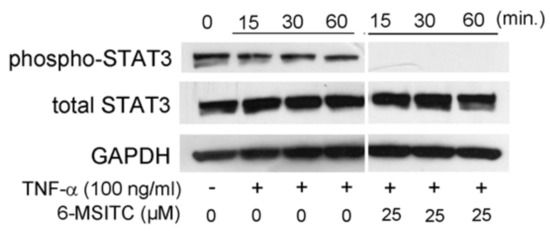 It has been reported that TNF-α stimulation activates the STAT3 signaling pathway [10]. Therefore, we examined whether 6-MSITC inhibits STAT3 phosphorylation. Our study showed that 6-MSITC can clearly inhibit STAT3 activation. No previous studies have examined the effect of 6-MSITC on STAT3 activation. However, there have been reports of the effects of other isothiocyanates on STAT3. For example, sulforaphane, a well-known isothiocyanate, has been reported to suppress STAT3 activation in a hepatocellular carcinoma cell line [11]. Hence, inhibition of the STAT3 signaling pathway may be a common feature of isothiocyanates. Further studies are necessary to prove the hypothesis.