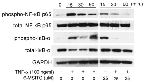 6-MSITC mediated inhibition of a NF-κB pathway in TNF-α stimulated TR146 cells. After pretreatment with 6-MSITC (25 μM) for one hour, TR146 cells were stimulated with TNF-α for 15, 30, or 60 min, and then phosphorylation of NF-κB p65 and IκB-α, and IκB-α degradation were determined by Western immunoblotting. The figure reports the results of a representative experiment performed three times with qualitatively comparable results.