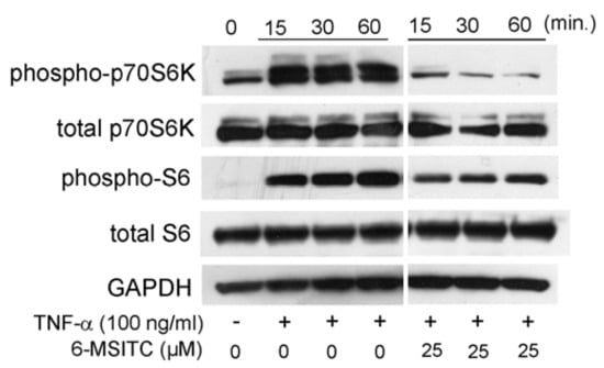 6-MSITC mediated inhibition of a p70S6K-S6 pathway in TNF-α stimulated TR146 cells. After pretreatment with 6-MSITC (25 μM) for one hour, TR146 cells were stimulated with TNF-α for 15, 30, or 60 min, and then phosphorylation of p70S6K and S6 was determined by Western immunoblotting. The figure reports the results of a representative experiment performed three times with qualitatively comparable results.
